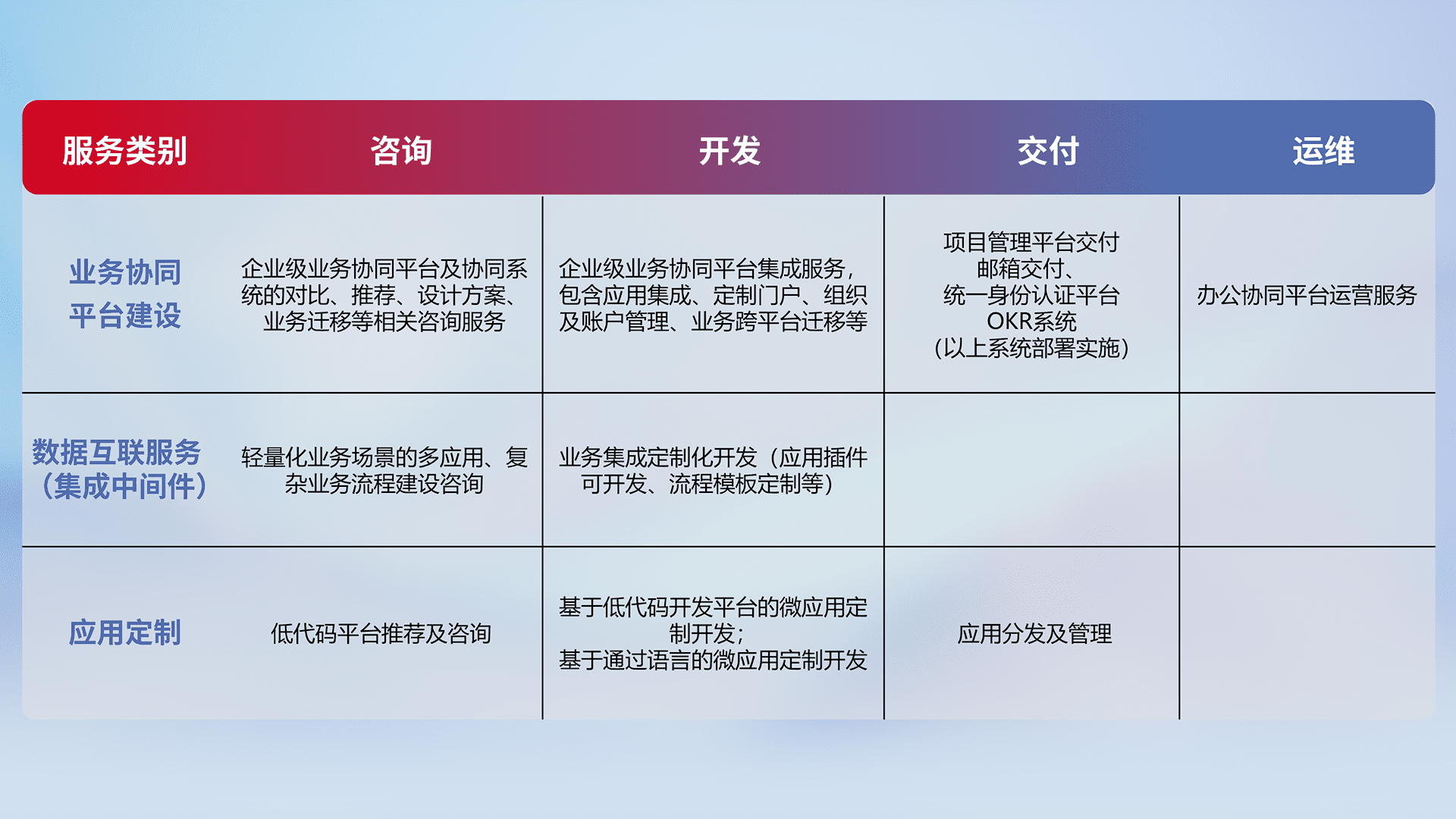 针对钉钉、、企微、、、、IDaas等平台级产品提供产品的规划、、方案、、、、交付、、定制化开发等服务,,,实现如统一协同办公、、、智能客户服务、、、、混合会议管理、、智能数据查询、、、、等业务场景,,,实现数字化转型。。